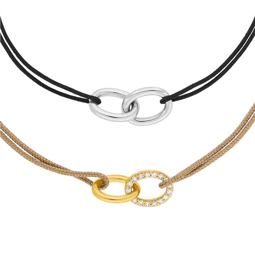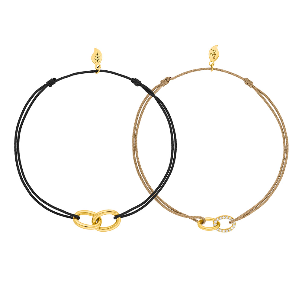 Die verstellbaren Synthetikbänder stehen für einen modernen, alltagstauglichen Look, während feine Armketten aus Gold eine besonders elegante Note setzen. Gemeinsam schaffen sie Schmuckstücke, die Nähe sichtbar machen – ganz ohne Worte.