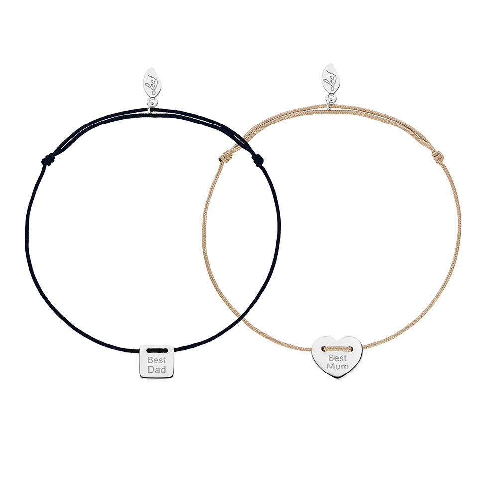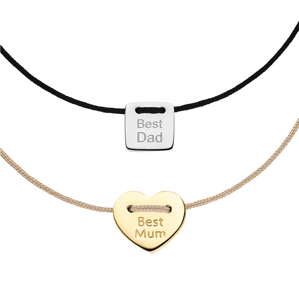 Partnerschmuck ist nicht nur für Liebespaare da. Die „Best Mum“ & „Best Dad“ Partnerarmbänder feiern Familie, Zusammenhalt und bedingungslose Liebe. Ein Herzplättchen für Best Mum und ein rechteckiges Plättchen für Best Dad – beide aus 14 Karat Gold – getragen an verstellbaren Synthetikbändern. Ein emotionales Geschenk für Eltern, das Wertschätzung und Stolz ausdrückt.